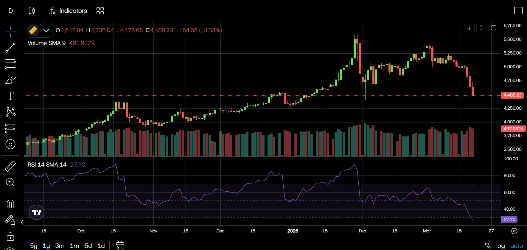 Since we last analysed the Gold CFD chart on 14 March 2026, it is clear that our hypothesis has failed the no supply test or test of supply. Based on the chart below, we can see how there was only one low spread, low volume green bar followed by three large spread, high volume red bars clearly demonstrating strength in the sell-side. RSI has also slid into the oversold area.